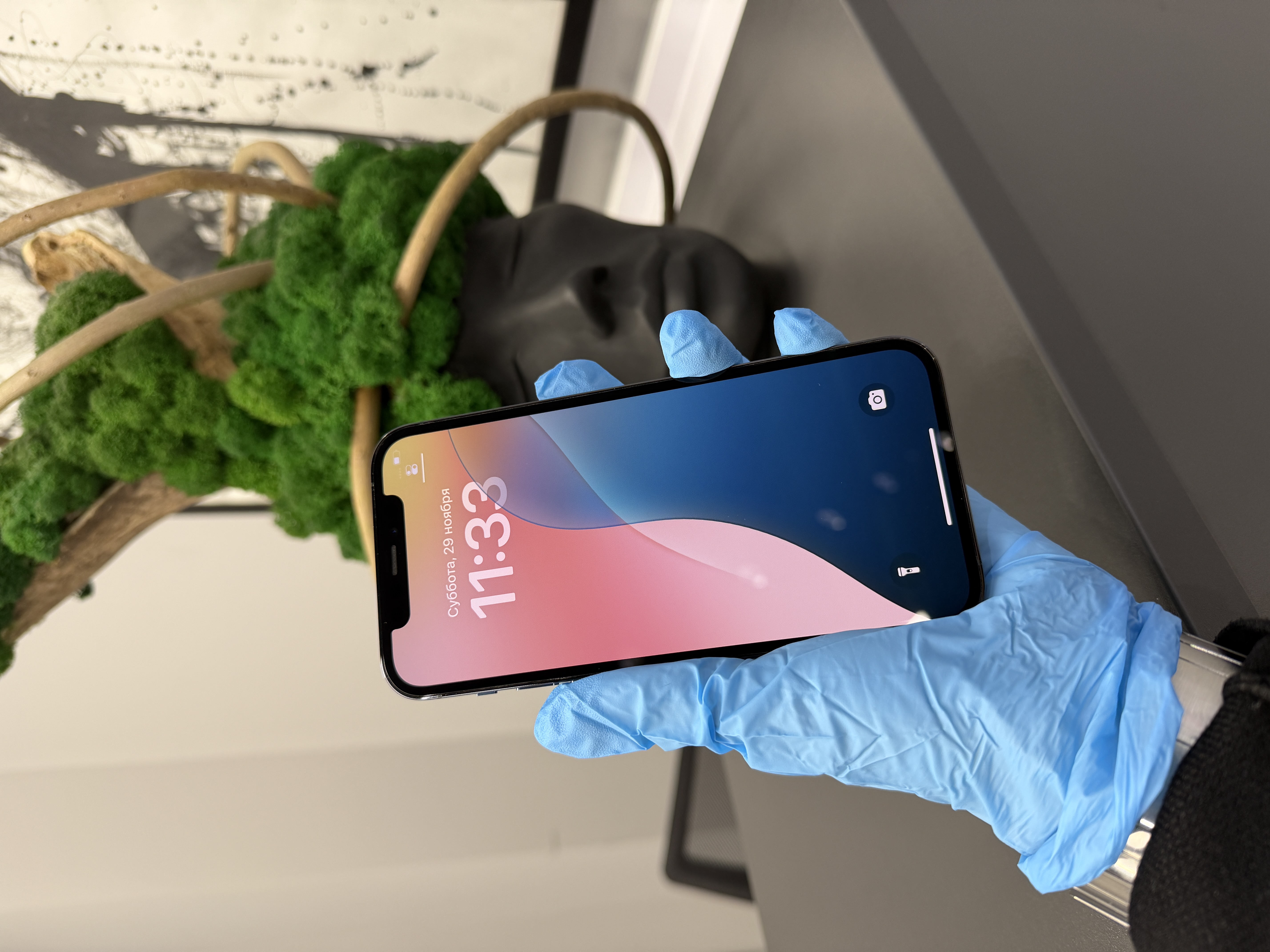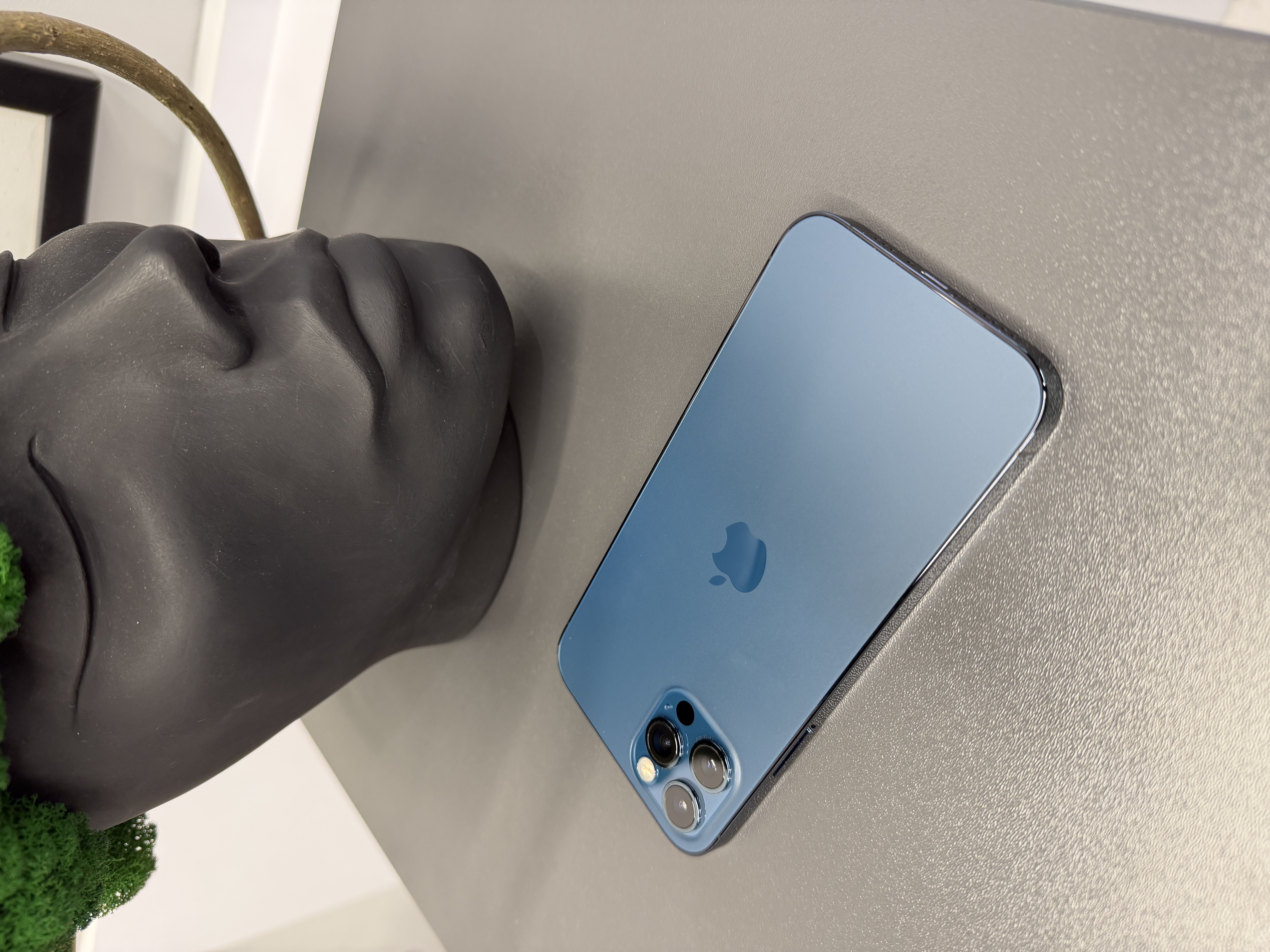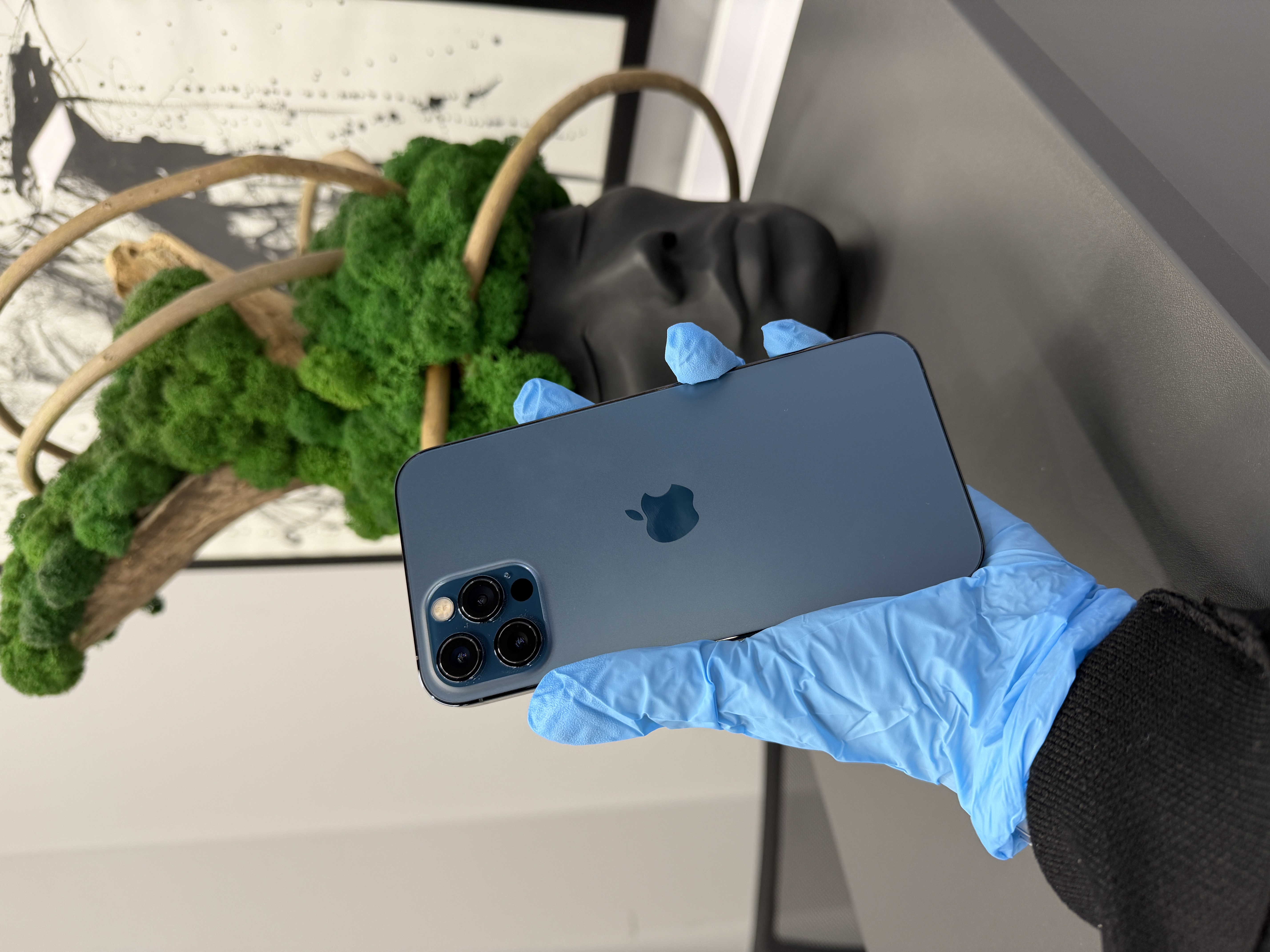iPhone 12 Pro в цвете Pacific Blue, со свежеустановленным нами аккумулятором.