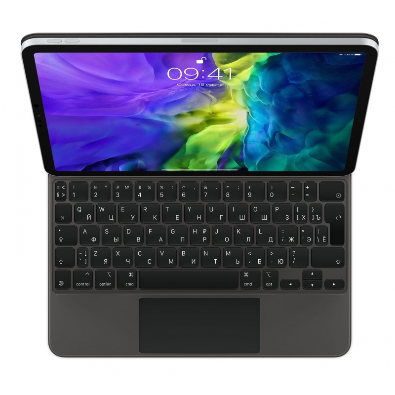 Apple Magic Keyboard – это новая клавиатура для iPad Pro с трекпадом. Он способен распознавать все жесты Multi Touch, а со специальным курсором управлять планшетом удобнее, так как он подстраивается под контент. Изменилась и сама клавиатура: теперь она оснащена клавишами с механизмом «ножницы», с ходом 1мм и подсветкой. К планшету клавиатура крепится с помощью специальных магнитов, сам iPad при этом остается на весу. Его угол наклона можно изменять, чтобы подобрать максимально удобное положение. На клавиатуре есть порт USB-C, который позволяет заряжать и сам планшет. Ну а в сложенном виде клавиатура превращается в защитный чехол для iPad:- Оснащена трекпадом, который распознает жесты Multi Touch;