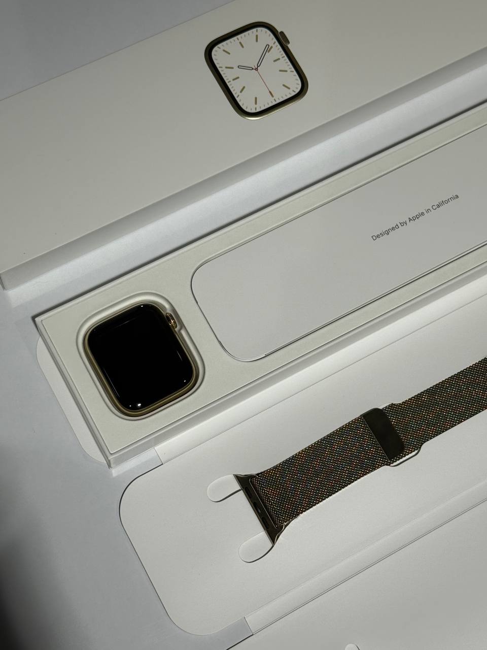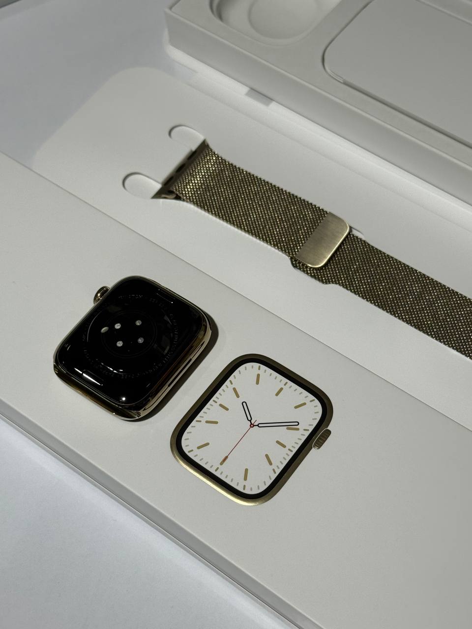 Apple Watch Series 7, 45 мм, корпус из нержавеющей стали золотого цвета , миланский сетчатый браслет золотого цвета (GPS+ Cellular) Б/У MKJY3ZP/a
