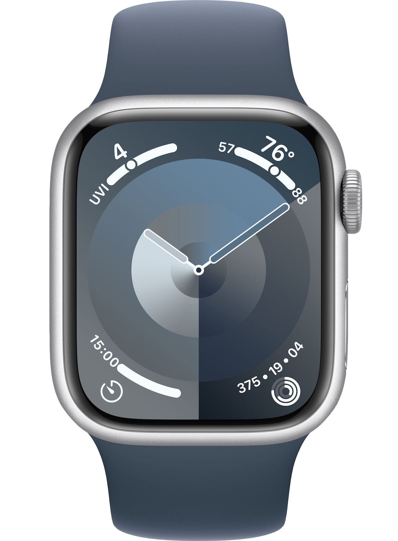 Apple Watch Series 9 41mm корпус из алюминия серебристого цвета, спортивный ремешок цвета «грозовой синий» (GPS) S/M