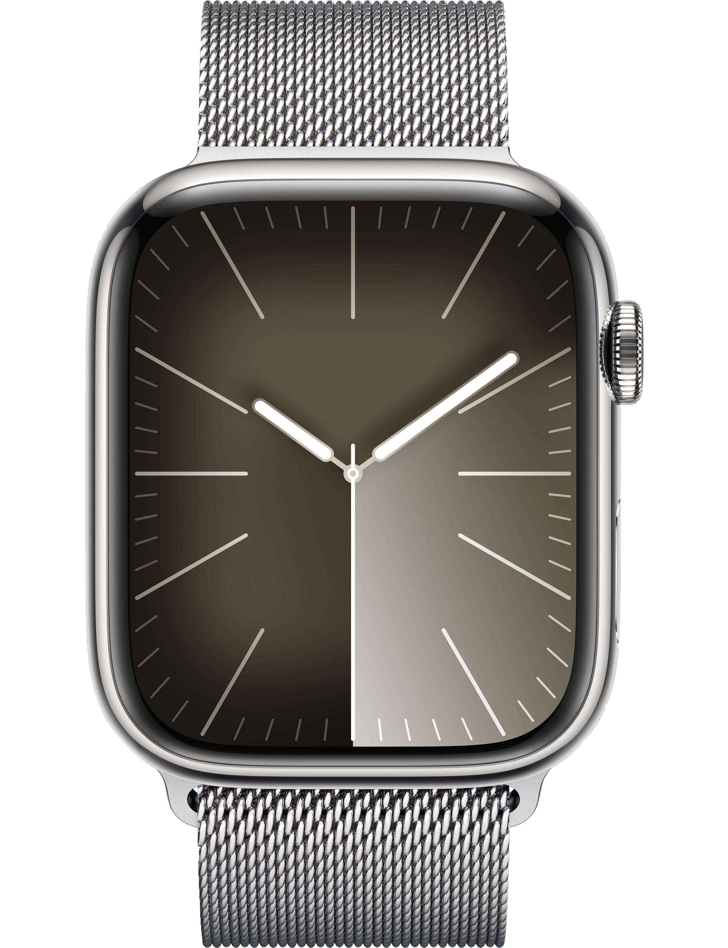 Apple Watch Series 9 45mm корпус из нержавеющей стали серебристого цвета, миланский сетчатый браслет серебристого цвета (GPS + LTE)