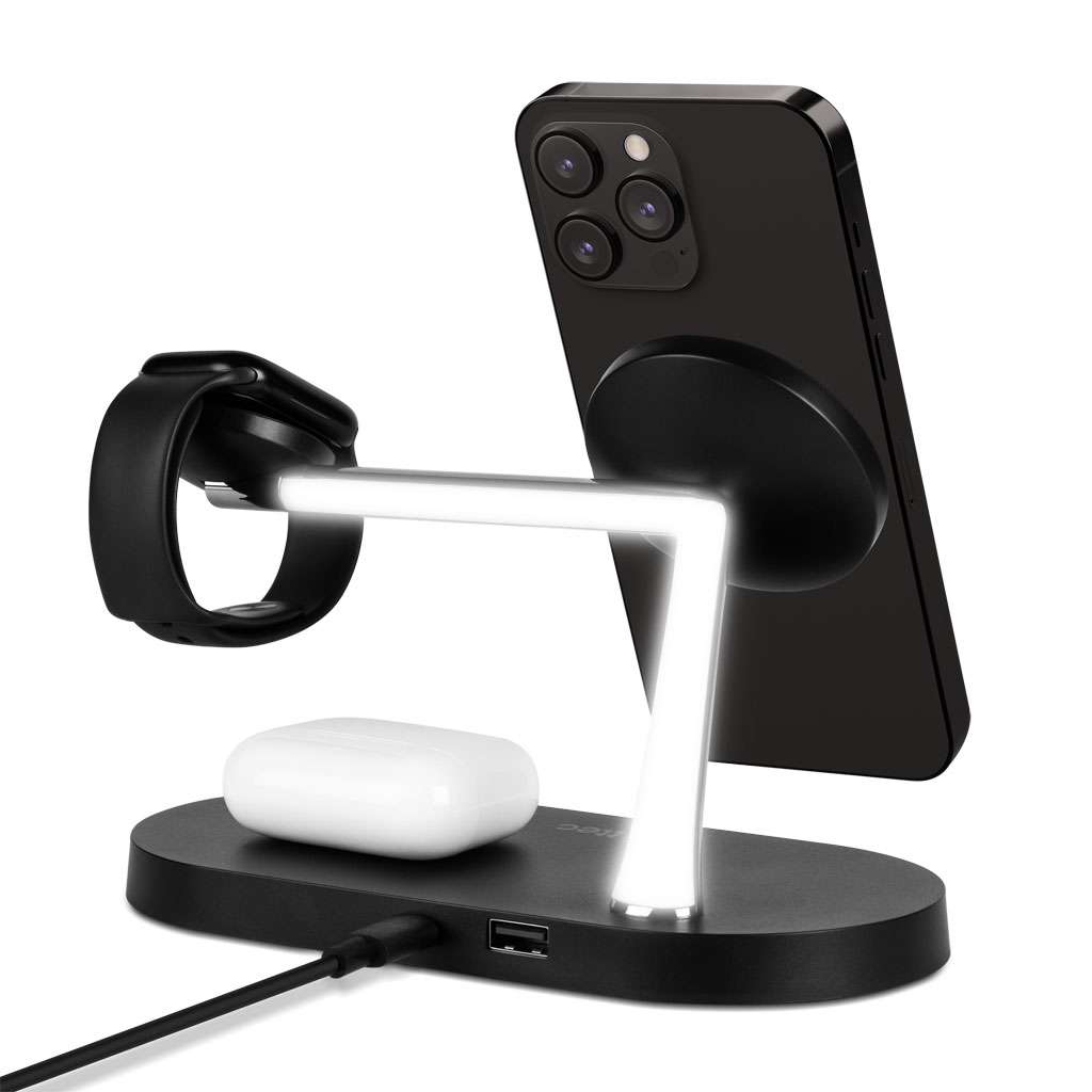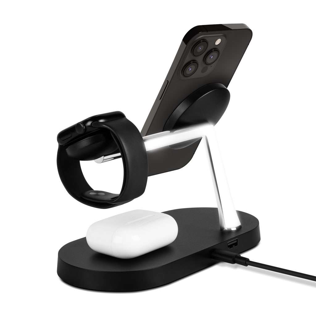 TTEC AirCharger Quattro M — универсальная беспроводная станция 4-в-1 с поддержкой MagSafe, созданная для владельцев техники Apple. Одновременно заряжает iPhone, Apple Watch и AirPods, а дополнительный выход USB-A на 10 Вт позволяет подпитать ещё одно устройство проводом — например, планшет или смартфон без MagSafe. Мощность распределена оптимально: iPhone — до 7,5 Вт, AirPods — 2 Вт, Apple Watch — 3 Вт. Компактная и аккуратная, она заменяет несколько зарядок на столе и держит всё в порядке.