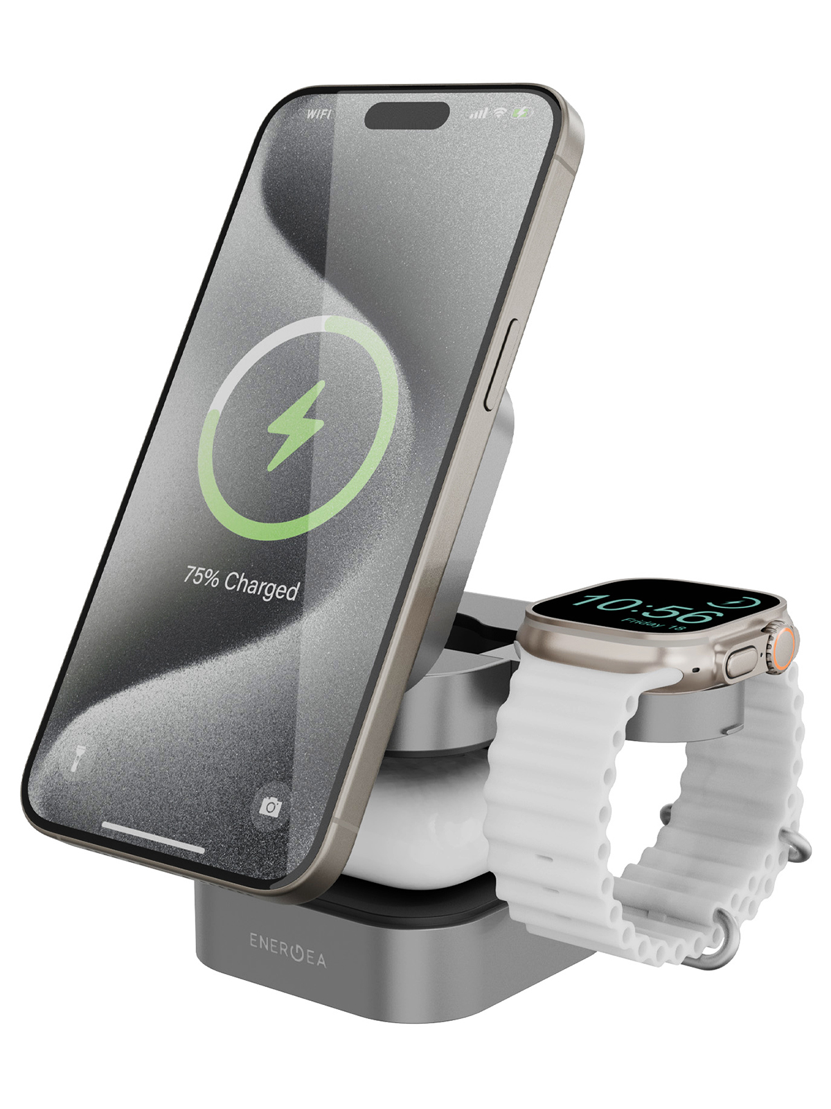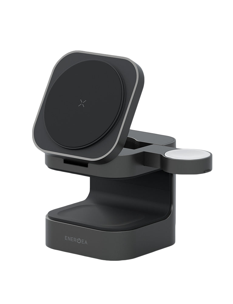 Energea MagCube 3-в-1 — компактная и стильная складная зарядная станция, способная одновременно заряжать смартфон, Apple Watch и беспроводные наушники. Поддерживает MagSafe, Qi2 и сертификацию MFW (Made For Watch), обеспечивая общую мощность до 25 Вт: 15 Вт для телефона, 5 Вт для часов и 5 Вт для наушников. Корпус выполнен из алюминия и пластика с антискользящей поверхностью. Основная платформа регулируется по углу, позволяя заряжать смартфон в вертикальном или горизонтальном положении. В комплекте — кабель USB-C и чехол для переноски. Для быстрой зарядки требуется блок питания от 30 Вт.