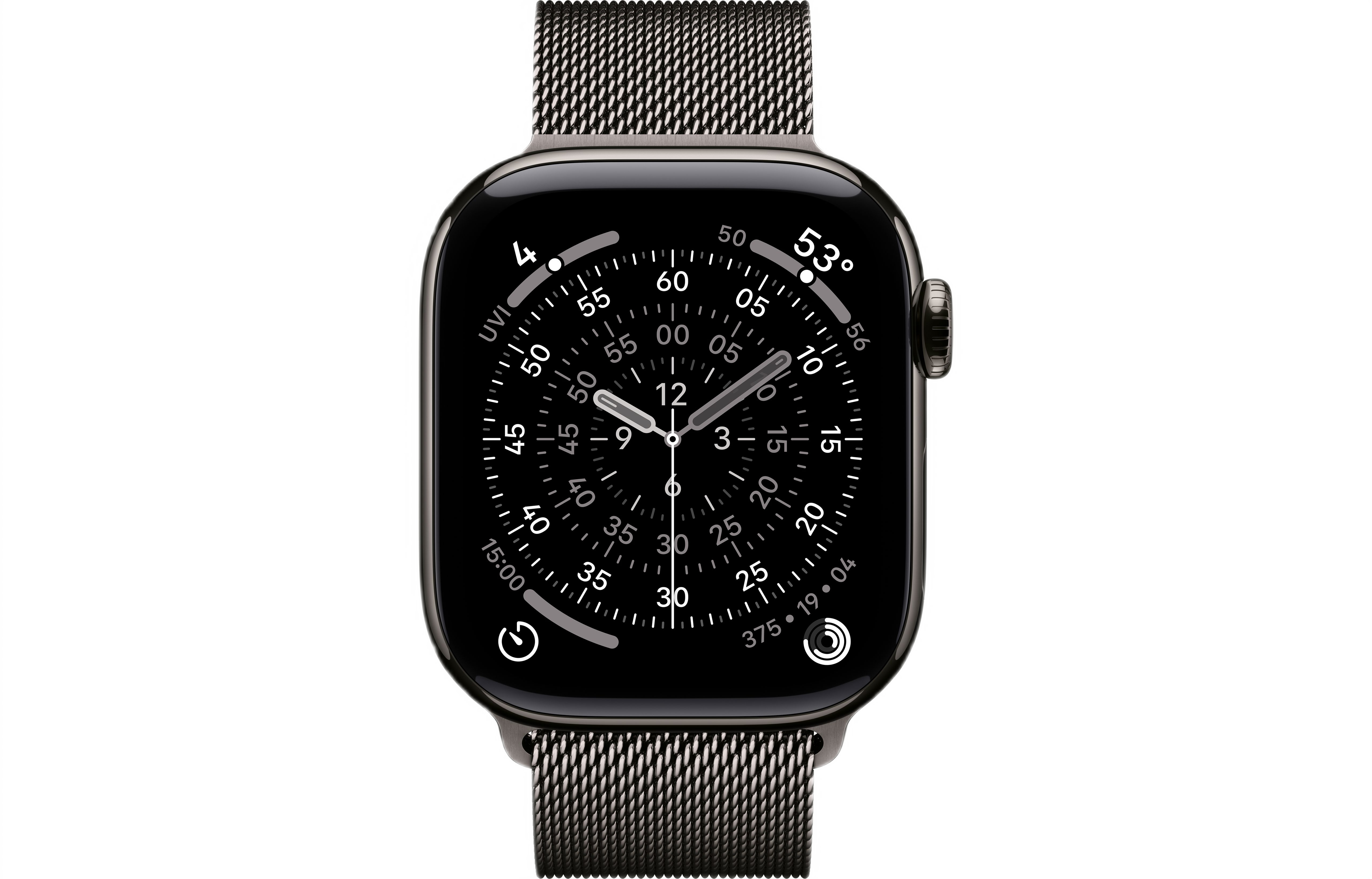 Часы стали тоньше, а дисплей — больше, благодаря новым размерам корпуса 42 и 46 мм. Яркость Always-On Retina дисплея достигает 2000 нит, что обеспечивает идеальную читаемость на солнце. Модели из титана теперь оснащены идеально плоским сапфировым стеклом, что придаёт им особенно премиальный и строгий вид. Это самые изящные и прочные Apple Watch в истории.