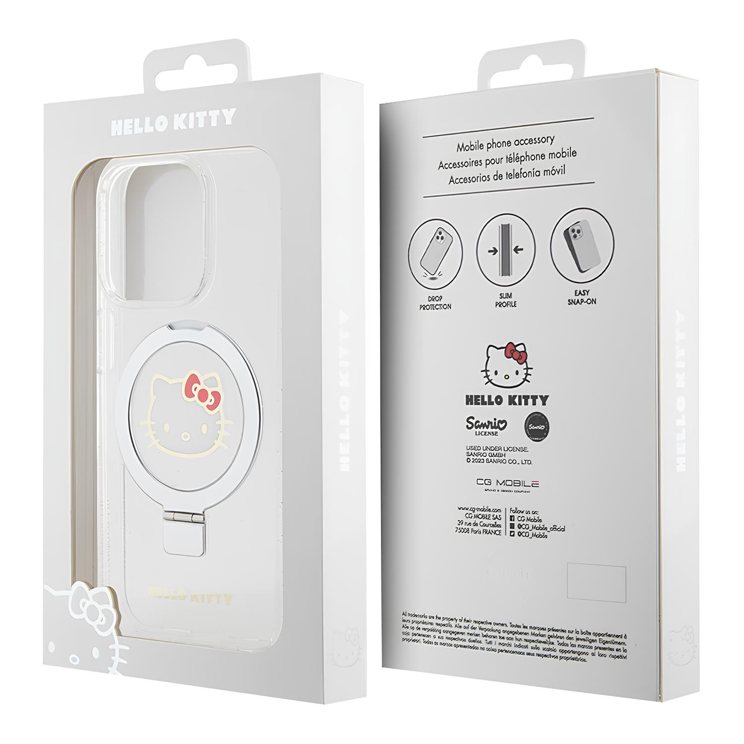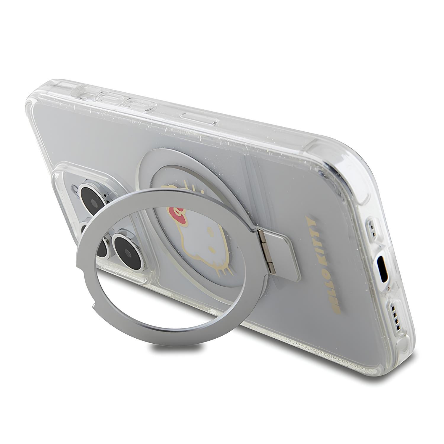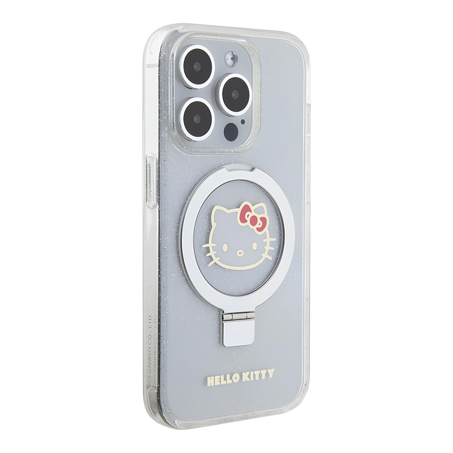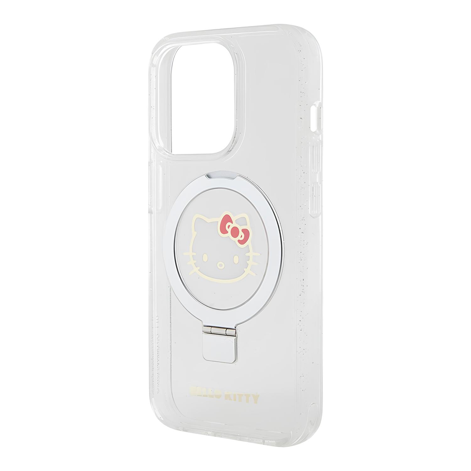 Чехол Hello Kitty для iPhone 15 Pro MagSafe Kitty Head + Ring Stand Hard Glitter Transparent