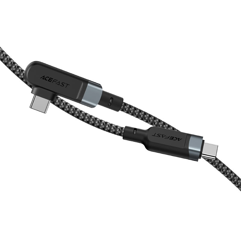 Кабель ACEFAST C5-03 USB-C → USB-C 2 м. Угловой коннектор расположен сбоку, под углом 90°. Поддерживает Power Delivery до 100 Вт (5 А), стабилен благодаря встроенному E-Marker-чипу, занимающемуся распределением тока. Прочный — тканевая оплётка, TPE-изоляция, коннекторы из сплава цинка. Расчёт на долговечность: ≈30 000 изгибов.