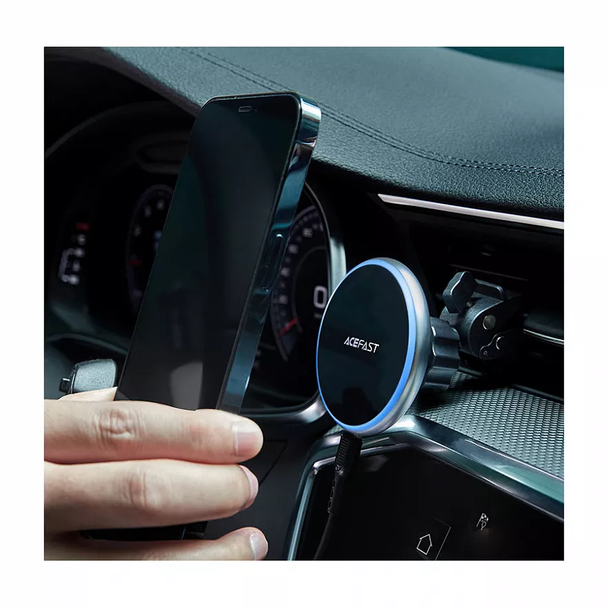 Магнитный держатель ACEFAST D3 — удобный автомобильный аксессуар с поддержкой беспроводной зарядки до 15 Вт. Совместим с iPhone 12/13/14/15 через MagSafe. Крепится на дефлектор или приборную панель, обеспечивает надёжную фиксацию смартфона во время поездки и быстрый доступ к экрану.
