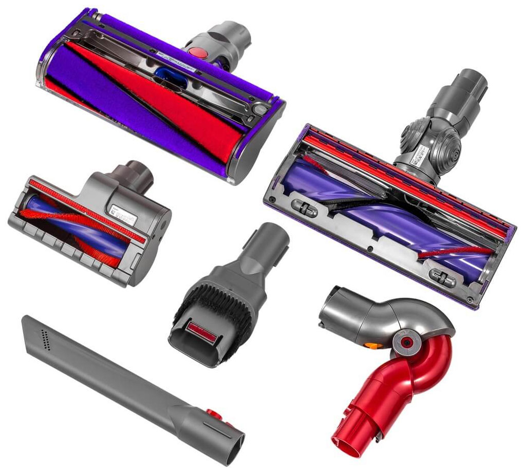 Пылесос Dyson V10 Absolute оснащен кучей разных насадок, что позволяет ему эффективно бороться с грязью на всех типах поверхностей. Независимо от того, ковры это, мебель, полы или даже потолки – пылесос легко справится с уборкой благодаря своим многофункциональным насадкам.
