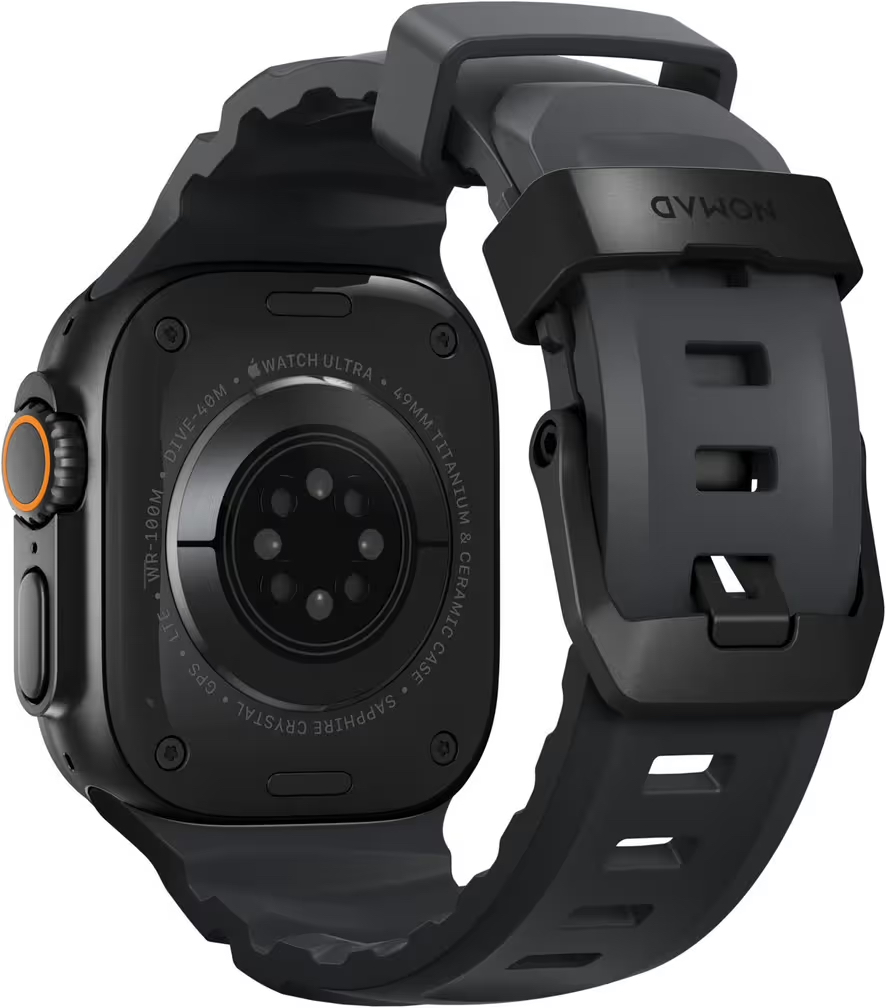 Nomad Rocky Point Band для Apple Watch (42/44/45/49 мм) — ремешок из FKM-фторэластомера с титановыми элементами. Лёгкий, прочный и водостойкий; создан для активной жизни, быстро сохнет и не боится пота. Серьезный ремешок для серьезных часов.