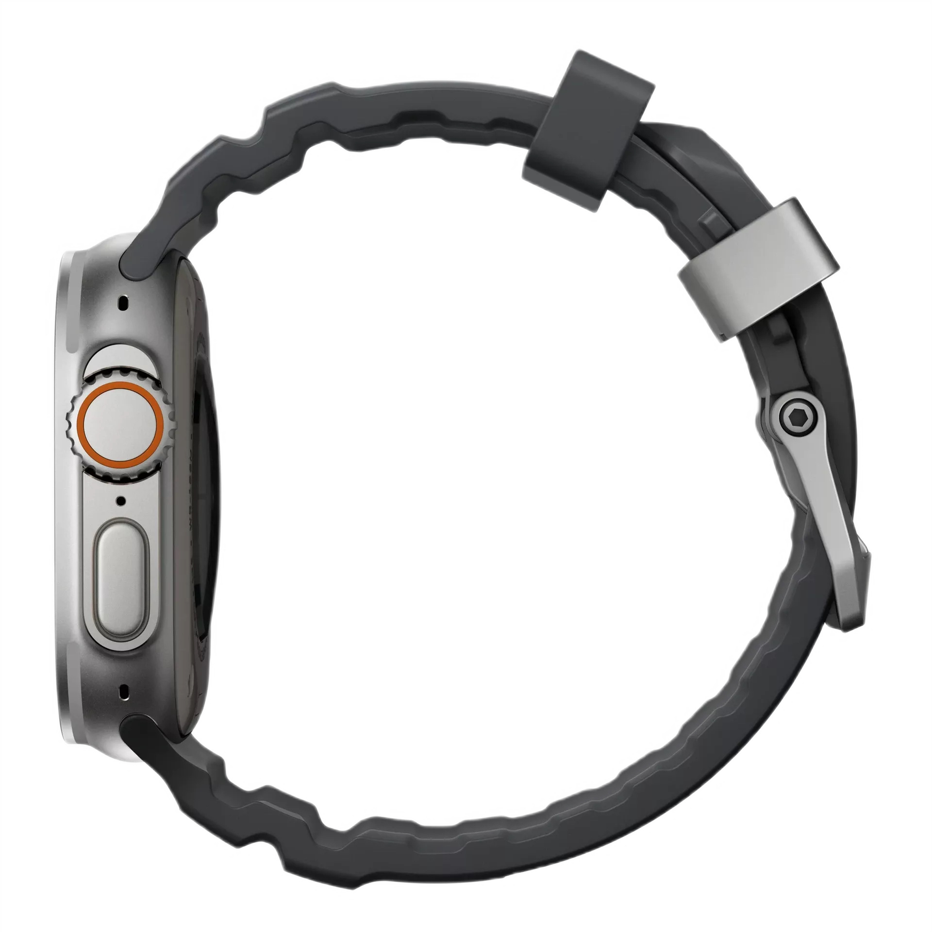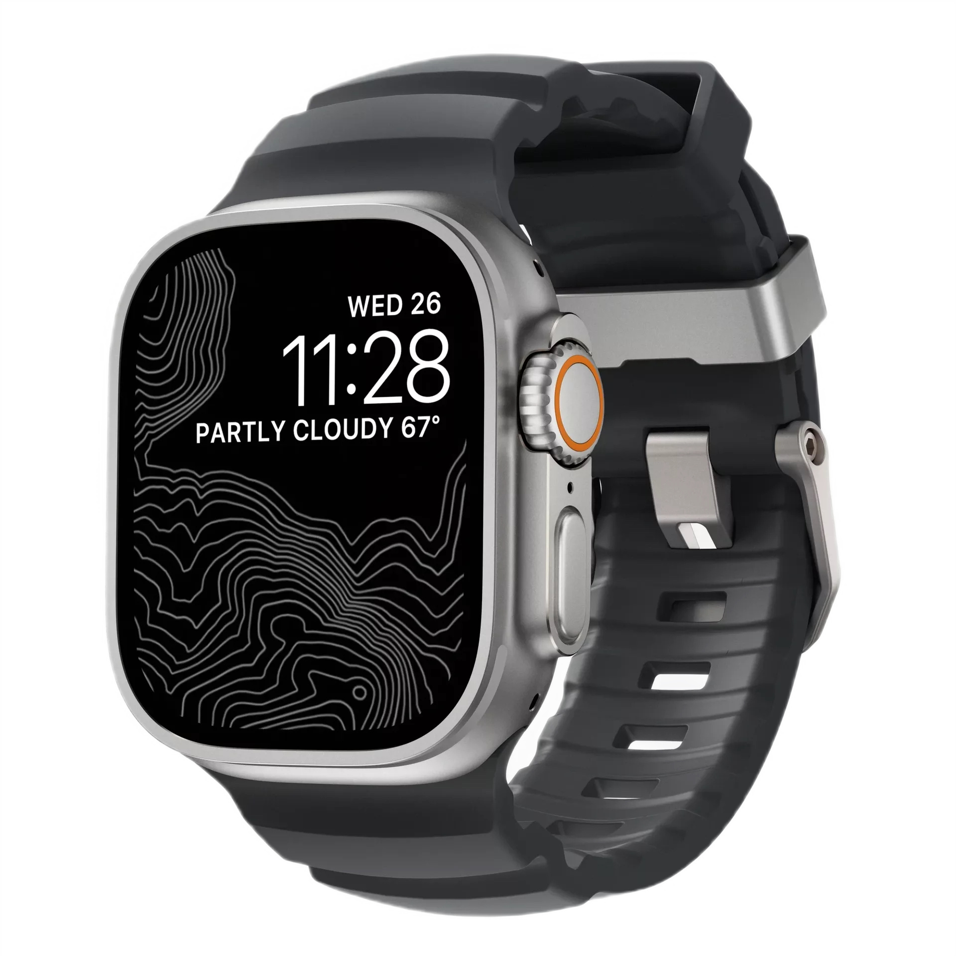 Nomad Rocky Point Band для Apple Watch (42/44/45/49 мм) — ремешок из FKM-фторэластомера с титановыми элементами. Лёгкий, прочный и водостойкий; создан для активной жизни, быстро сохнет и не боится пота. Серьезный ремешок для серьезных часов.