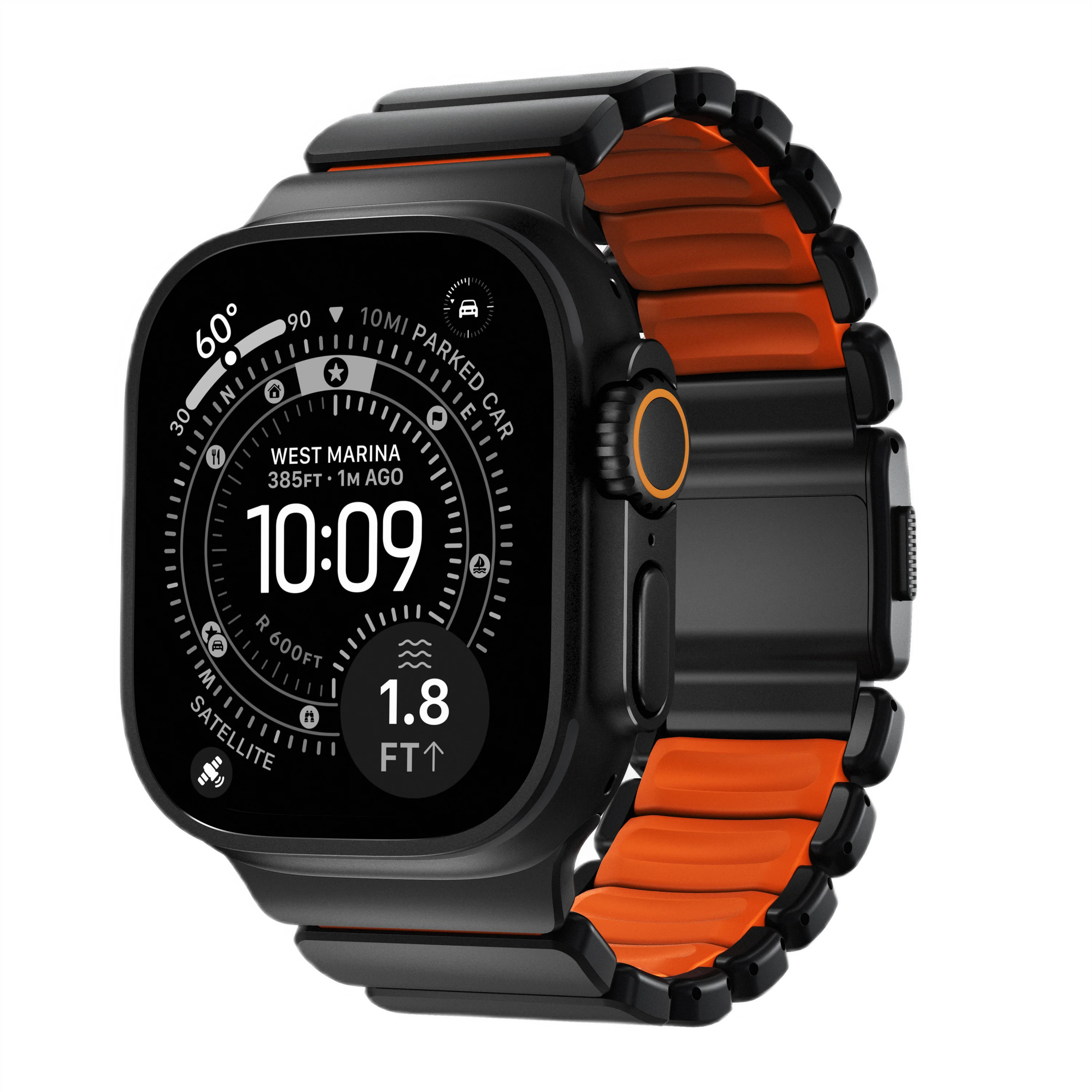 Ремешок Nomad Stratos объединяет несочетаемое: внешний каркас звеньев отлит из титана Grade 4, а внутренняя часть выполнена из мягкого фторэластомера (FKM). Титан Grade 4 значительно прочнее стандартных сплавов, используемых в аксессуарах, а специальное DLC-покрытие защищает поверхность металла от царапин и потертостей, сохраняя премиальный вид даже при жесткой эксплуатации.