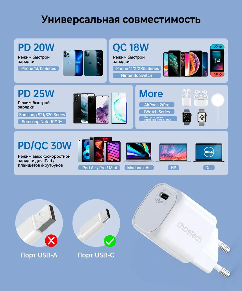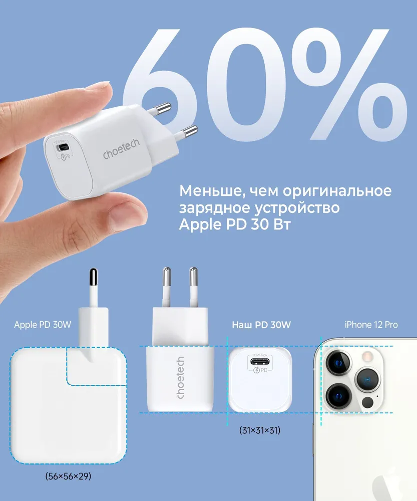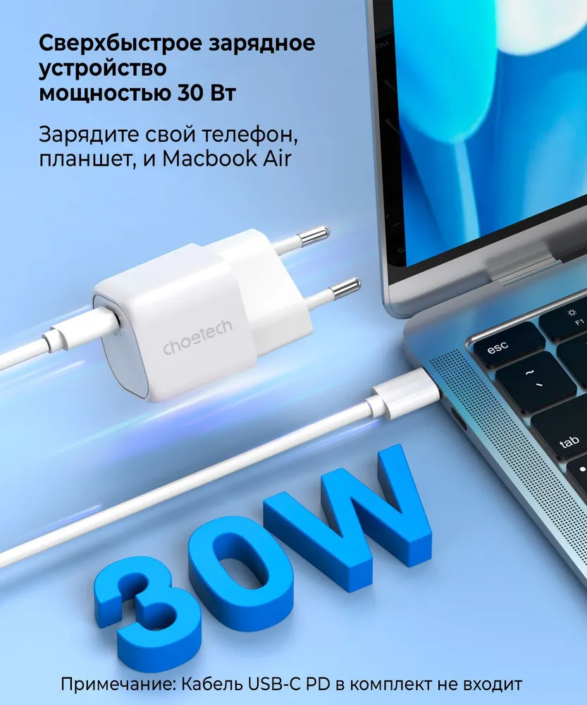 Сетевое зарядное устройство Choetech GAN 30Вт (USB-С) PD Travel