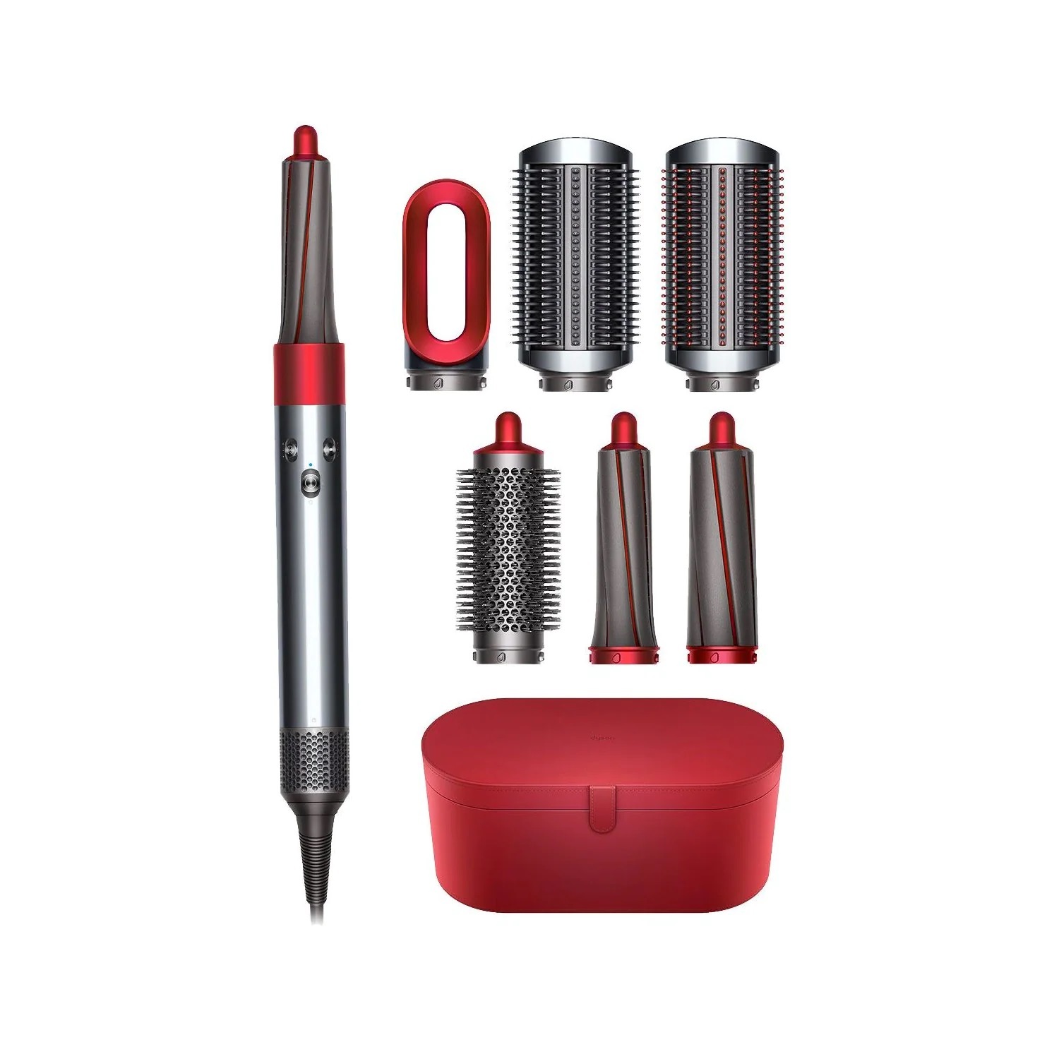 Комплектациия: стайлер, насадка для сушки волос, 30-мм цилиндрические насадки (2шт), 40-мм цилиндрические насадки (2шт), жесткая щетка для выпрямления, мягкая щетка для выпрямления, круглая щетка для создания объема, нескользящий коврик, щетка для очистки фильтра, чехол для хранения, дорожный чехол.