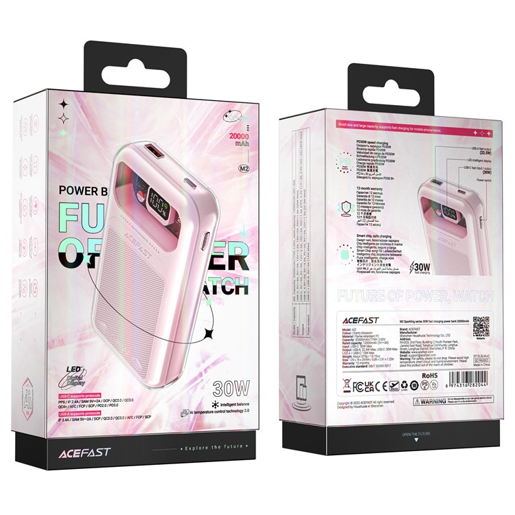ACEFAST M2 20000 mAh Sparkling Series — мощный и стильный power bank с поддержкой быстрой зарядки до 30 Вт. Оснащён USB-C портом и USB-A, чтобы заряжать сразу два устройства, от смартфонов до планшетов и даже игровых консолей. У LED-дисплея видно текущий заряд и активный протокол зарядки. Поддерживаются PD, PPS, QC 2.0/3.0/4+, SCP и другие популярные стандарты. Безопасность гарантируют многоступенчатые защиты от перегрева, короткого замыкания и перенапряжения, а корпус из ПК+ABS прочен и надёжен.