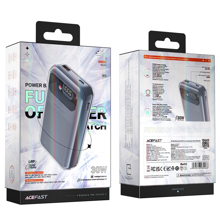 ACEFAST M2 20000 mAh Sparkling Series — мощный и стильный power bank с поддержкой быстрой зарядки до 30 Вт. Оснащён USB-C портом и USB-A, чтобы заряжать сразу два устройства, от смартфонов до планшетов и даже игровых консолей. У LED-дисплея видно текущий заряд и активный протокол зарядки. Поддерживаются PD, PPS, QC 2.0/3.0/4+, SCP и другие популярные стандарты. Безопасность гарантируют многоступенчатые защиты от перегрева, короткого замыкания и перенапряжения, а корпус из ПК+ABS прочен и надёжен.