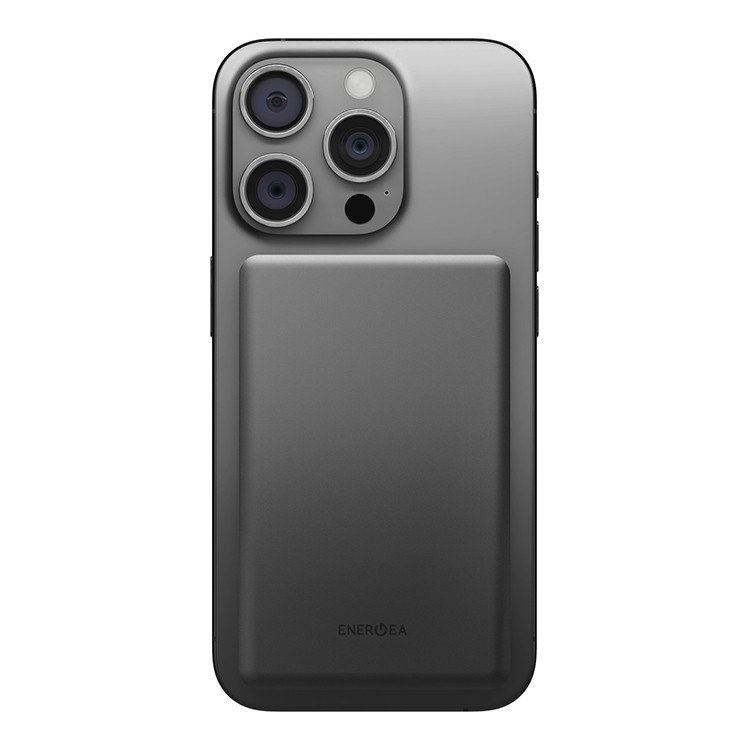 EnergEA AluPac Air 5K — компактный внешний аккумулятор в лёгком алюминиевом корпусе. Прищёлкивается к iPhone, заряжает без проводов до 15 Вт, а через USB-C выдаёт до 20 Вт по PD. Удобен для повседневного ношения: сильно не утяжеляет смартфон и помещается в карман.