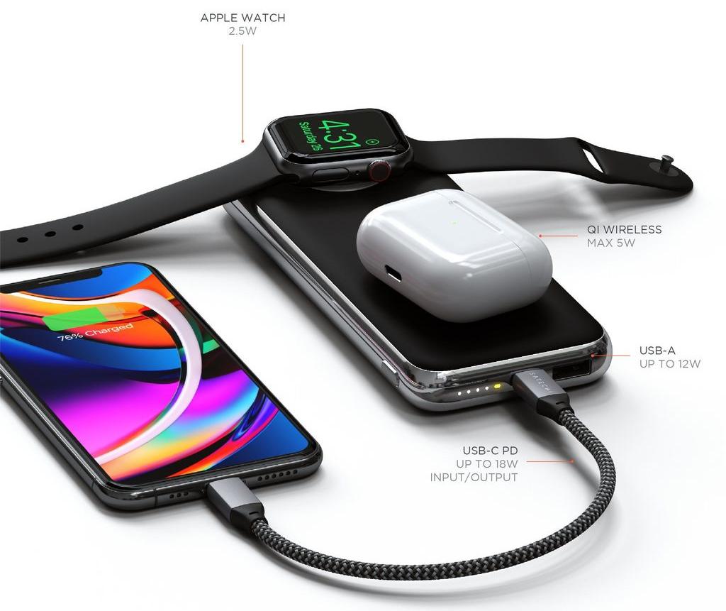Satechi Quatro Wireless Power Bank 10 000 мА·ч — необычный пауэрбанк, который умеет одновременно заряжать телефон, часы, наушники и ещё что-нибудь по проводу.