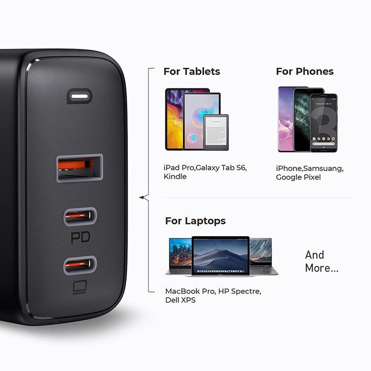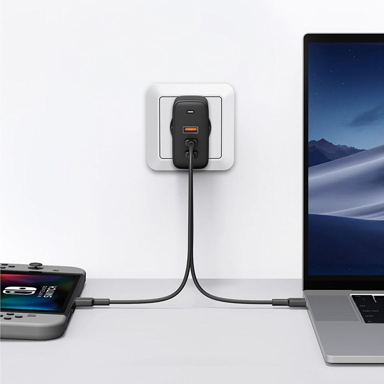 У Aukey Omnia три порта (два USB-C и один USB-A), чтобы заряжать можно было сразу три устройства от одного адаптера. Один из портов Type C способен развивать мощность до 90Вт, а все благодаря технологии быстрой зарядки Power Delivery 3.0. Этого хватит, чтобы зарядить даже MacBook Pro 16, а другие гаджеты будут заряжаться быстрее обычного. Для того, чтобы мощность между портами распределялась равномерно, применяется технология Dynamic Detect.